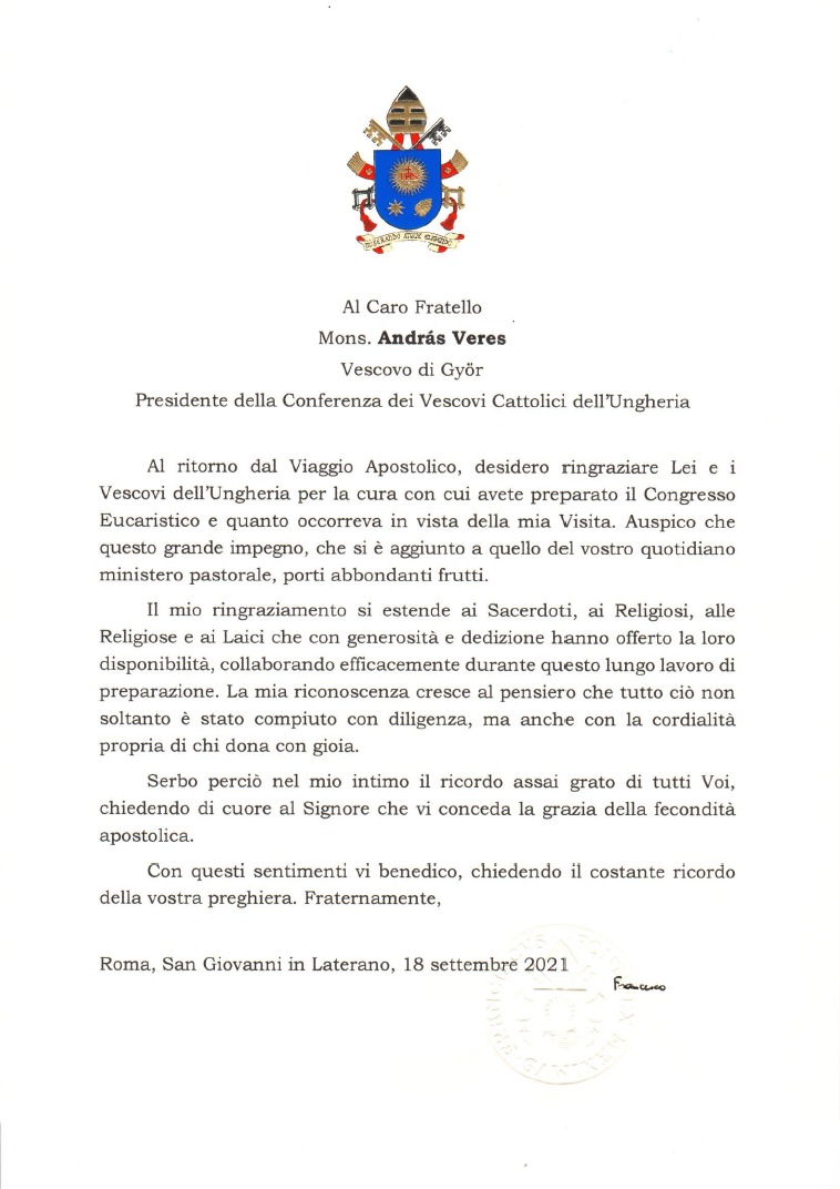 Nella lettera che è stata inviata da Papa Francesco al vescovo András Veres, Presidente della Conferenza Episcopale Ungherese, ha ringraziato i membri della Conferenza per il lavoro preparativo sia nel caso di 52° Congresso Eucaristico Internazionale, sia nel caso della sua visita. La lettera del Santo Padre verrà trasmessa per esteso.
