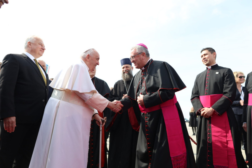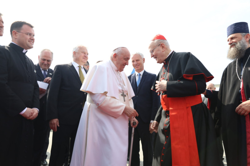 A repülőtéren a Szentatyát fogadta egyházi részről Erdő Péter bíboros, prímás, esztergom-budapesti érsek; Michael Wallace Banach apostoli nuncius; Veres András győri megyéspüspök, a Magyar Katolikus Püspöki Konferencia (MKPK) elnöke, valamint Tóth Tamás, az MKPK titkára, a Szentatya magyarországi apostoli látogatásának általános koordinátora; állami részről Semjén Zsolt miniszterelnök-helyettes, Szijjártó Péter külgazdasági és külügyminiszter, Rétvári Bence, a Belügyminisztérium parlamenti államtitkára; Soltész Miklós, a Miniszterelnökség egyházi és nemzetiségi kapcsolatokért felelős államtitkára és Azbej Tristan, a Miniszterelnökség üldözött keresztények megsegítéséért és a Hungary Helps Program megvalósításáért felelős államtitkára.