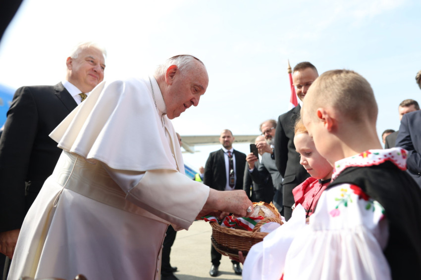 Ferenc pápát üdvözölte több tucat gyermek is, akik a Katolikus Egyház világi munkatársainak gyermekei, közülük ketten frissen sült kenyeret és sót adtak át a Szentatyának.