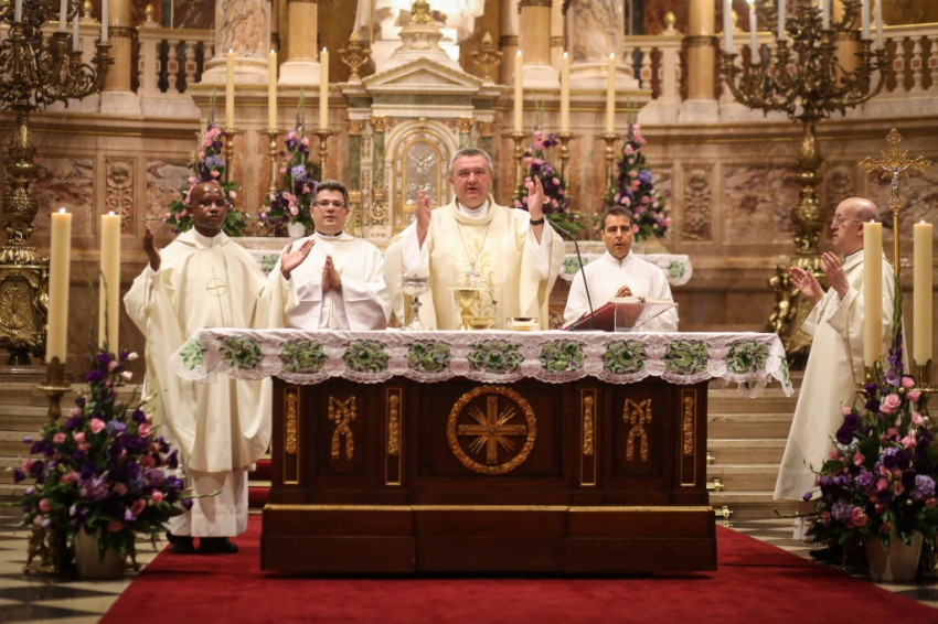 Őszentsége, Ferenc pápa megválasztásának ötödik évfordulója alkalmából jöttünk el a Szent István-bazilikába, hogy együtt imádkozzunk Érte és az egész Egyházért. Egy válságokkal teli időszakot élünk, amely mind az Egyházban, mind a társadalmi életben súlyos kihívások elé állít bennünket. Ezért mostani közös imádságunkban szükséges nemcsak a Pápáért és az Egyházért, hanem az egész világ békéjéért is imádkoznunk. Jézus bátorít bennünket: nevében bármit is kérjünk az Atyától, megadja nekünk (vö. Jn 15,16). Ezért terjesszük Isten elé bizalommal kéréseinket, mert Ő sohasem szűkmarkú a benne bízókhoz. Ferenc pápa is erre a hitből fakadó imádságra biztatja hallgatóit minden megszólalásában.