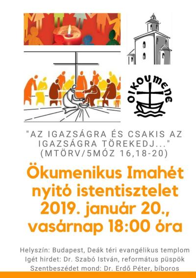 Az országos nyitó istentisztelet 2019. január 20-án, vasárnap 18 órakor lesz a Deák téri evangélikus templomban. Igét hirdet Dr. Szabó István református püspök, szentbeszédet mond dr. Erdő Péter bíboros. A liturgiában a MEÖT tagegyházainak vezetői szolgálnak.