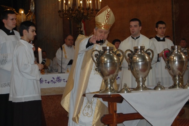 Nagycsütörtök délelőtt az olajszentelési szentmise vezeti be a hívőket a szent három nap ünneplésébe. A szentmise alatt kerül sor a keresztelendők (katekumenek) és a betegek olajának, valamint a – keresztség, bérmálás, egyházi rend kiszolgáltatásakor, illetve templomszenteléskor használatos – krizma megszentelésére. A püspök együtt misézik az egyházmegye papságával, akik megújítják a szenteléskor tett ígéreteiket.