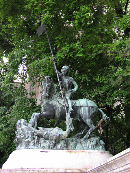 kép: Sárkányölő Szent György Kolozsvári Márton és György 1373-ban alkotott szobrának a másolata a Halászbástya lépcsősorának alján, jobb oldalt látható.