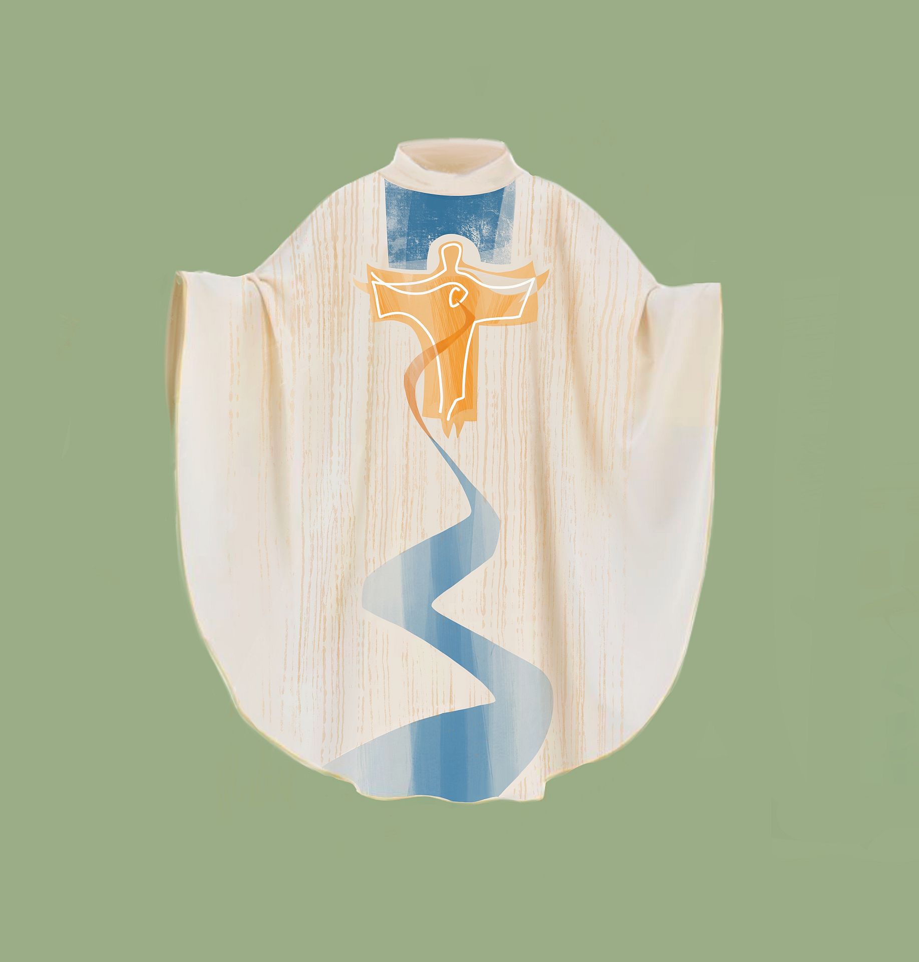 The graphic is based on the event’s motto: “Christ is our future”. The main decoration of the vestment is a drawing of the resurrected Christ, appearing as a white light contour against a golden background. Two streams flow from his heart (symbols of blood and water), widening to a river. The image of the river is a reference to the Danube, one of the country’s main symbols, and is also linked to the symbols of the International Eucharistic Congress held in our country a year and a half ago. The blue of the river matches the sky above the head of the resurrected Christ. The colour blue is a bridge between earth and heaven, reminding us to the Virgin Mary as well.