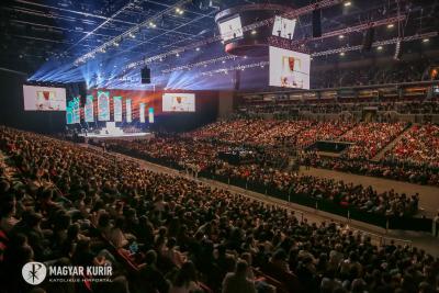 Rúzsa Magdi a Domine című számot énekelte; a Forráspont Band és a 4 Akkord Show Kórus dicsőítő dalokat játszottak; a fiatalok állva, lelkesen kapcsolódtak be az éneklésbe. Dolhai Attila, Nagy Bogi, Dánielfy Gergő, Szőcs Reni és Szandi előadásában elhangzott a találkozó és a pápalátogatás hivatalos dala, amelyet az Ignác, a lelkek lovagja című musicalből írtak át az alkalomra. Ferenc pápa korábban érkezett meg a Papp László Sportarénába, ahol óriási lelkesedéssel, tapssal fogadták.