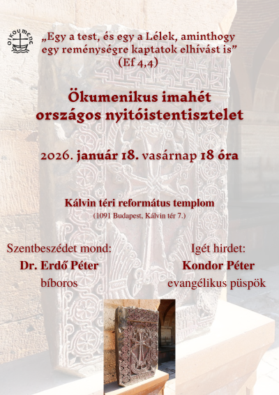 Idén az ökumenikus imahét országos nyitó istentisztelete január 18-án, vasárnap 18 órakor lesz a Kálvin téri református templomban. Igét hirdet Kondor Péter evangélikus püspök, szentbeszédet mond Erdő Péter bíboros. Az imahét imádságait és elmélkedéseit ezúttal az ősi Örmény Apostoli Egyház keresztény vezetői ajánlják a tagegyházak gyülekezeteinek figyelmébe.